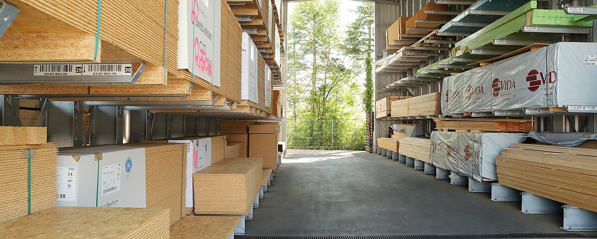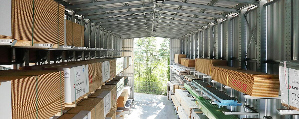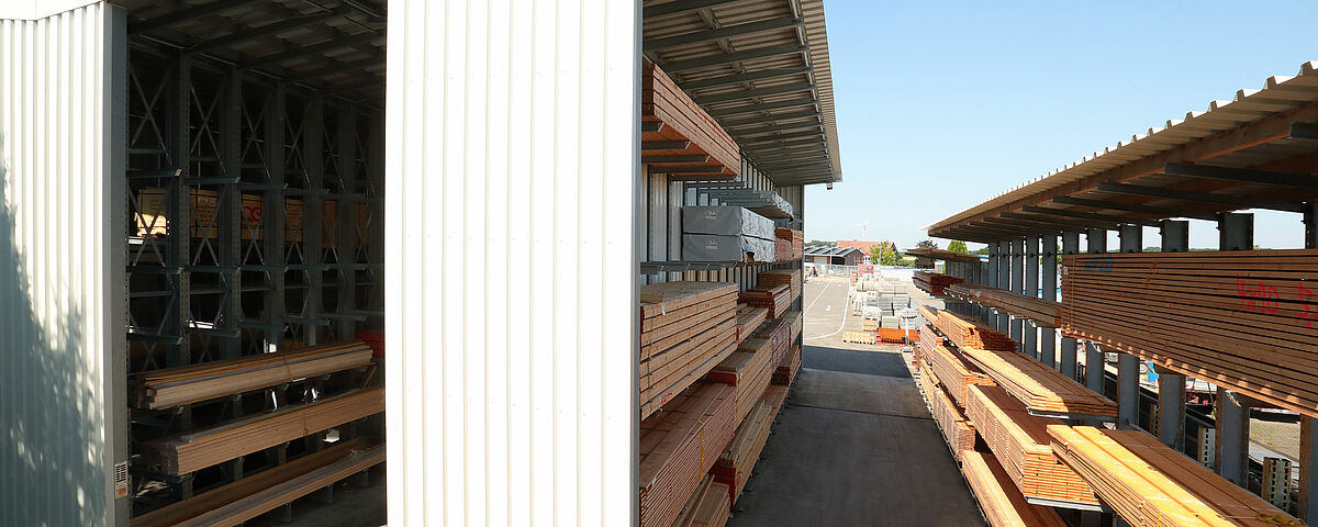 Afin de permettre à ses clients un meilleur aperçu et un accès plus rapide aux marchandises, BAUKING décida de stocker toutes les marchandises en bois dans un endroit centralisé du nouveau hall d’entreposage. En raison de ses rayonnages fonctionnant comme structure porteuse pour le toit et les parois, un tel système est nettement plus flexible et meilleur marché qu’un hall de stockage classique. BAUKING planifia la construction d’un hall composé de trois lignes de rayonnages dotées chacune d’une longueur d’environ 20 mètres. Les rayonnages cantilever de 7,8 mètres de haut sont équipés de sept niveaux de stockage.