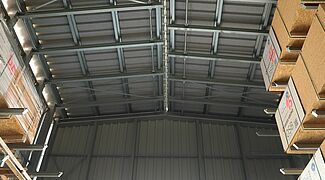 Les longueurs de rayonnages sont alignées le long d’une direction de pente. Étant donné que les bras cantilever des systèmes de rayonnages OHRA sont suspendus sur une colonne perforée étroite, les rayonnages peuvent facilement compenser la différence de hauteur d’environ 14 centimètres. Afin de compenser la deuxième pente dans le sens transversal par rapport aux lignes de rayonnages dans la structure de toit, OHRA réalisa une faîtière flexible. À cet égard, les bras de toit des rayonnages ne sont pas reliés les uns aux autres mais séparés par un espace d’environ 10 centimètres. La couverture est assurée par une faîtière flexible qui permet à l’intérieur du hall de rester au sec. Cette faîtière ne compense pas seulement la différence de hauteur entre les lignes de rayonnages, mais elle garantit aussi que les vibrations et tensions qui se produisent par exemple lors de l’entreposage ne se transmettent pas d’une ligne de rayonnages à l'autre. Ainsi, la structure de toit est protégée des dommages au niveau de la couverture. .