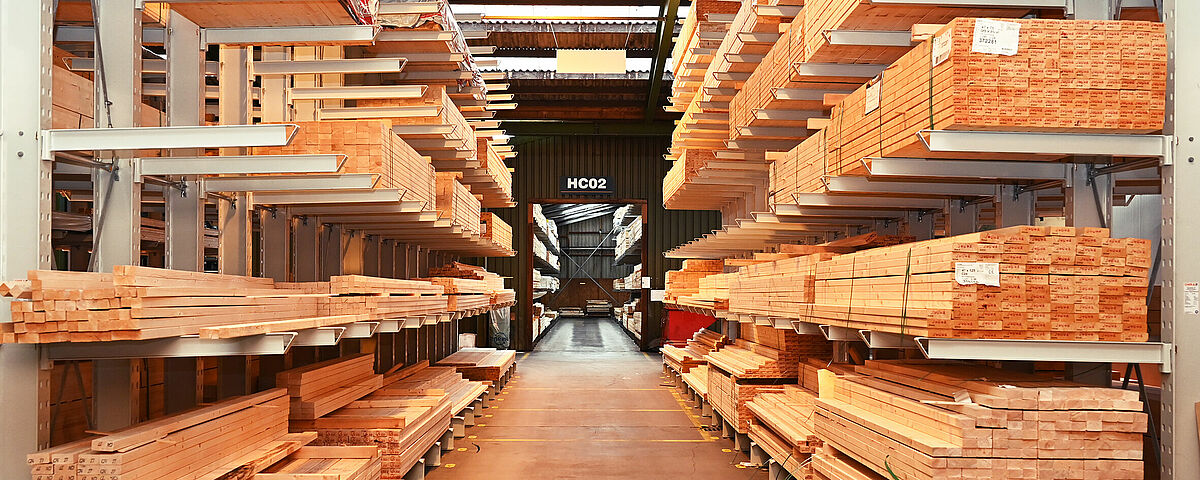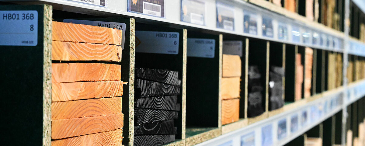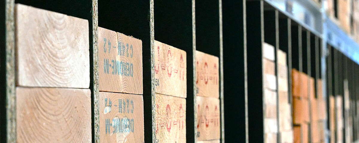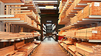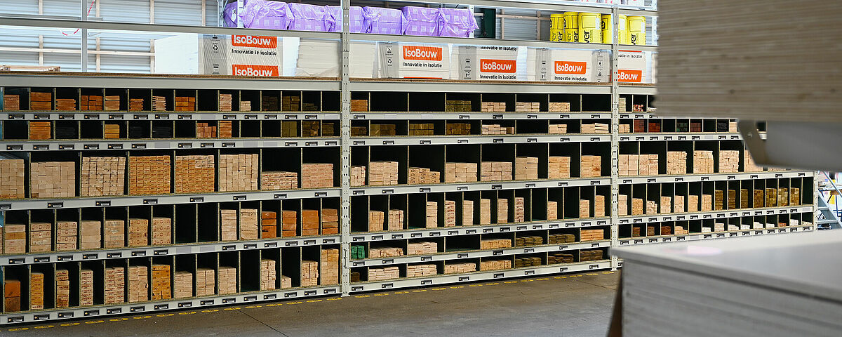 Afin d’obtenir une surface de stockage continue, OHRA monta des panneaux agglomérés en guise de fond dans les niveaux de stockage. Il sont séparés par des panneaux agglomérés d'une épaisseur de 18 millimètres que Brentjens a lui-même monté. Cela engendre des compartiments de largeurs différentes, dans lesquels les liteaux et lattes se laissent glisser facilement dans le sens longitudinal. Chaque compartiment est rempli avec un seul type d'article - le client détecte ainsi directement les diverses coupes transversales et peut accéder rapidement à la marchandise souhaitée. Le côté supérieur du rayonnage est par ailleurs exploité « classiquement » comme rayonnage à palettes ou rayonnage à tablettes et offre une surface de stockage supplémentaire pour les matériaux les plus divers.