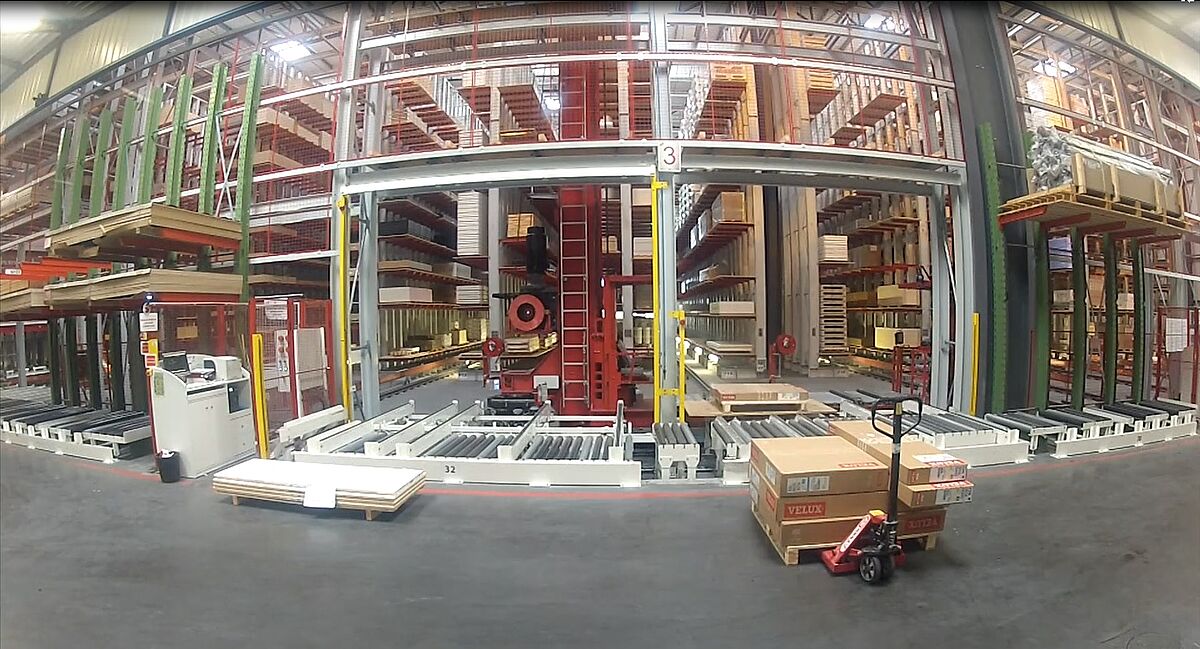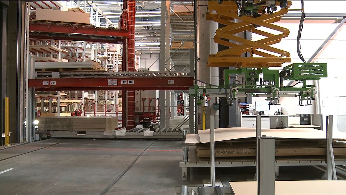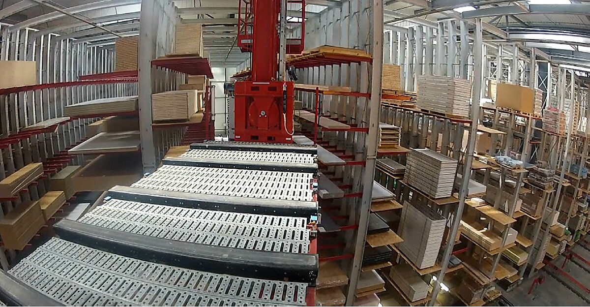Dans la zone 1, un transstockeur entièrement automatique effectue le stockage ou le déstockage des paquets de panneaux agglomérés ou des planches de parquet sur palettes pouvant atteindre 5,1 mètres de long et peser jusqu'à 5 tonnes. Le transstockeur pour courbes dessert ici les trois allées de cette zone. Les marchandises sont retirées de l'entrepôt pour répondre aux commandes clients ou aux ordres de fabrication pour la découpe interne. Des convoyeurs à chaîne et à rouleaux prennent les produits des transstockeurs pour les acheminer vers les postes de travail correspondants.