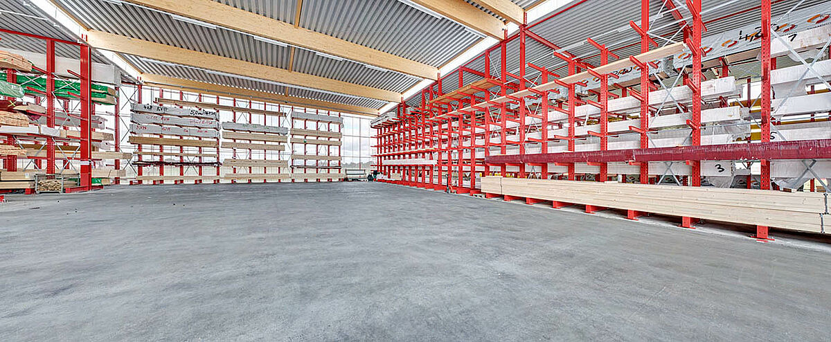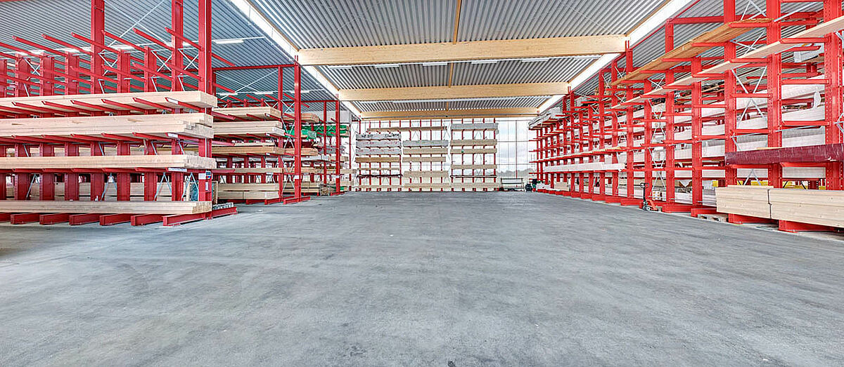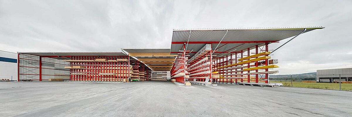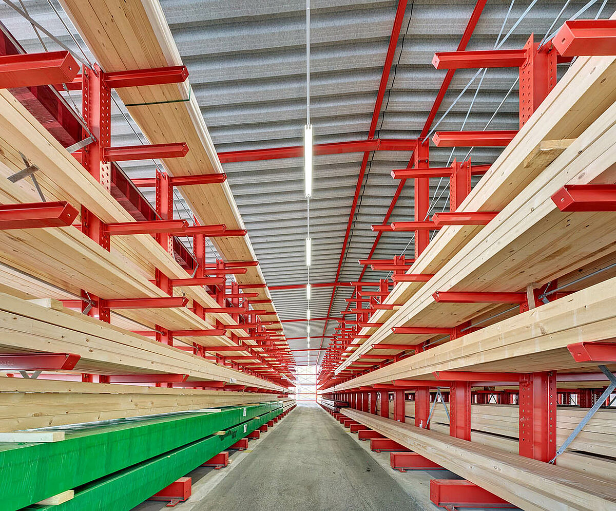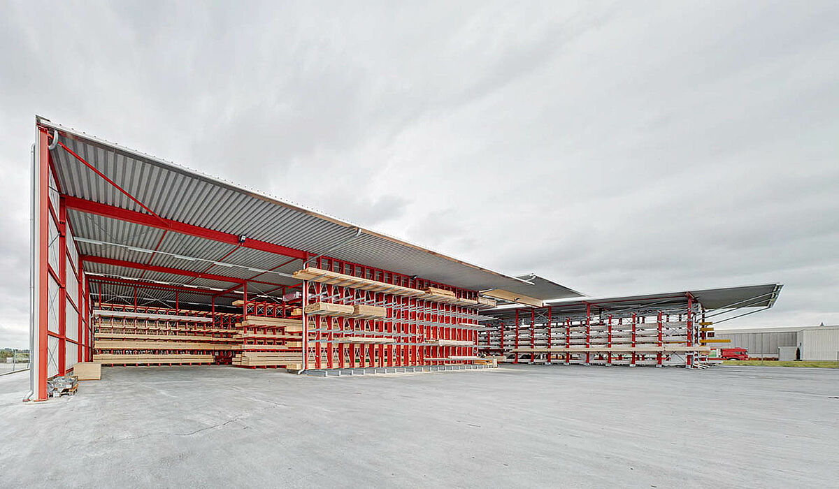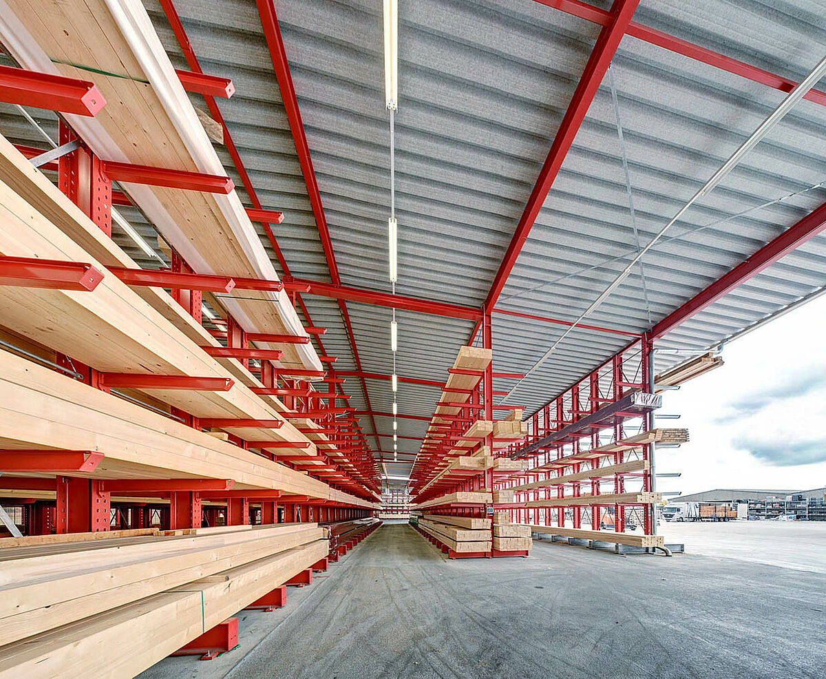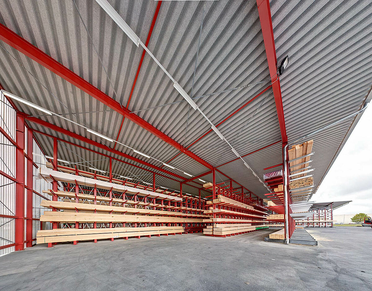 Déjà dans la planification du projet, il s’avère que l’utilisation de rayonnages cantilever avec construction de toiture est la meilleure solution et la plus économique. En tout, 250 tonnes d’acier pour les rayonnages et la toiture sont donc fabriqués, livrés et montés.