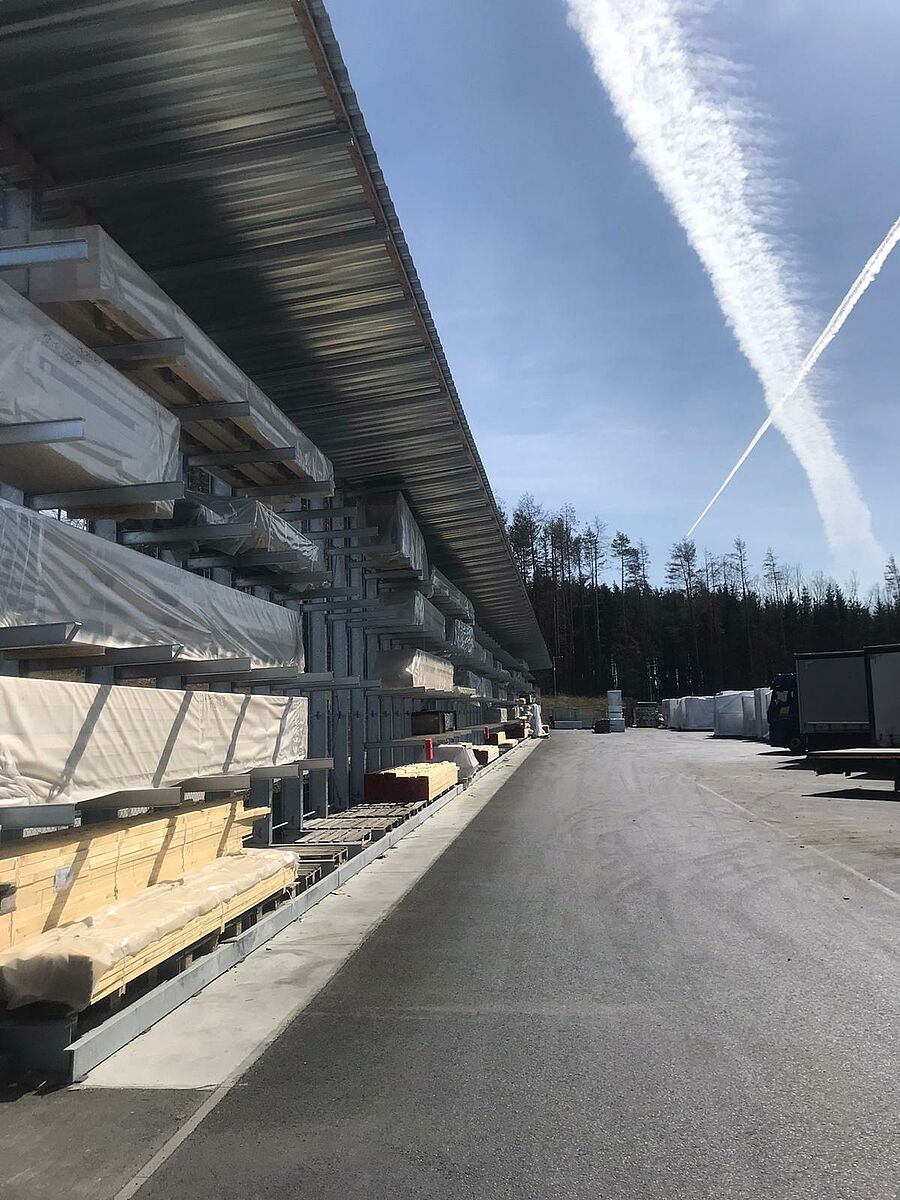 La société DFH Haus CZ produit notamment des maisons préfabriquées de marque Okal - il ne s'agit pas de projets surévalués, mais de maisons durables conçues et réalisées sur mesure. Grand est le besoin en stockage de matériaux destinés à la construction des éléments qui entrent dans la réalisation des maisons préfabriquées ; pour une capacité de stockage suffisante, l'entreprise a équipé depuis 2018 sa zone extérieure, de premiers rayonnages qui, grâce à leur galvanisation à chaud et leur toit en pente, résistent aux vents et aux intempéries. Ces étagères de 6 m de haut offrent jusqu'à cinq niveaux de stockage et disposent de bras cantilever de 1 200 mm de long, dont chacun peut supporter une charge d'une tonne.