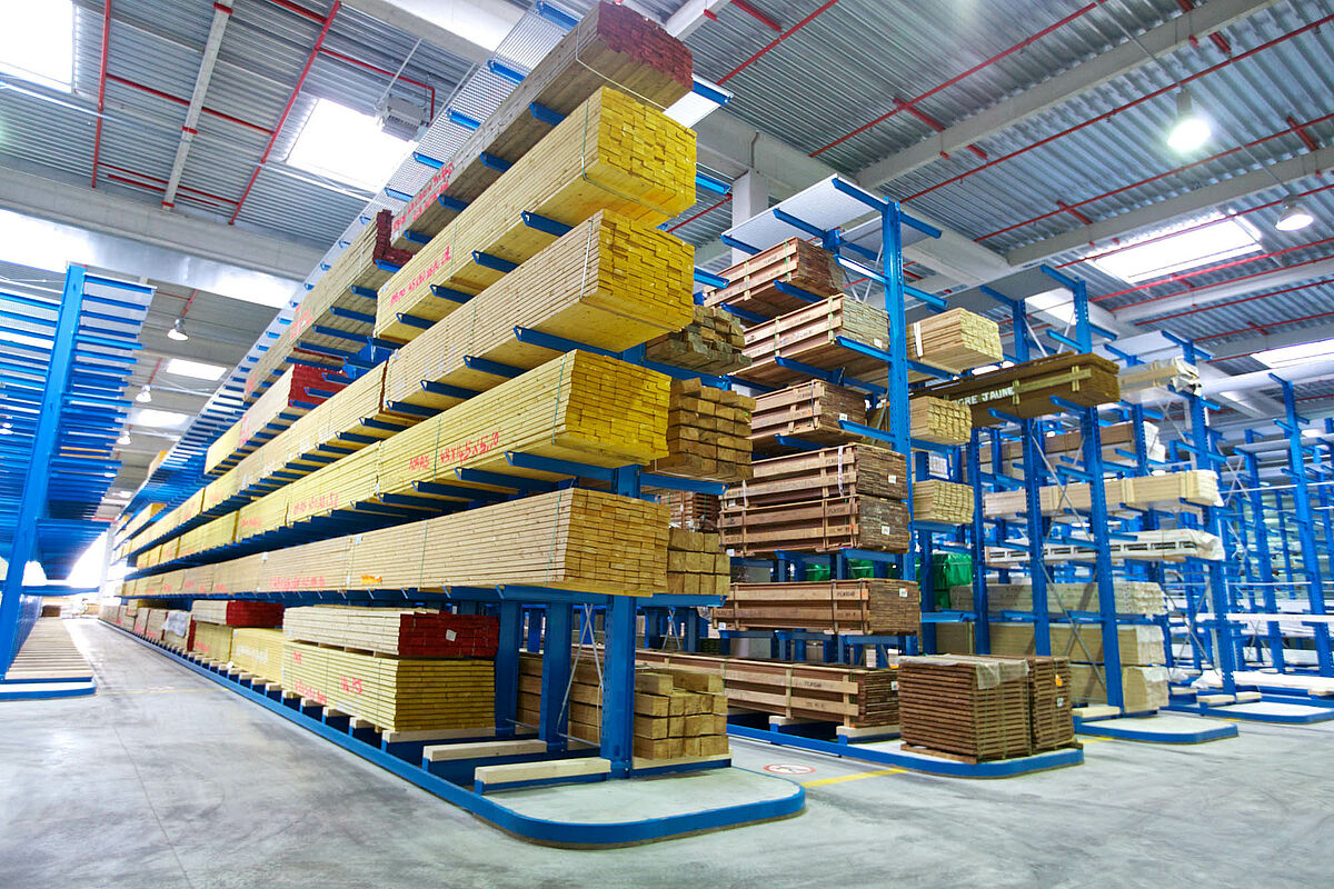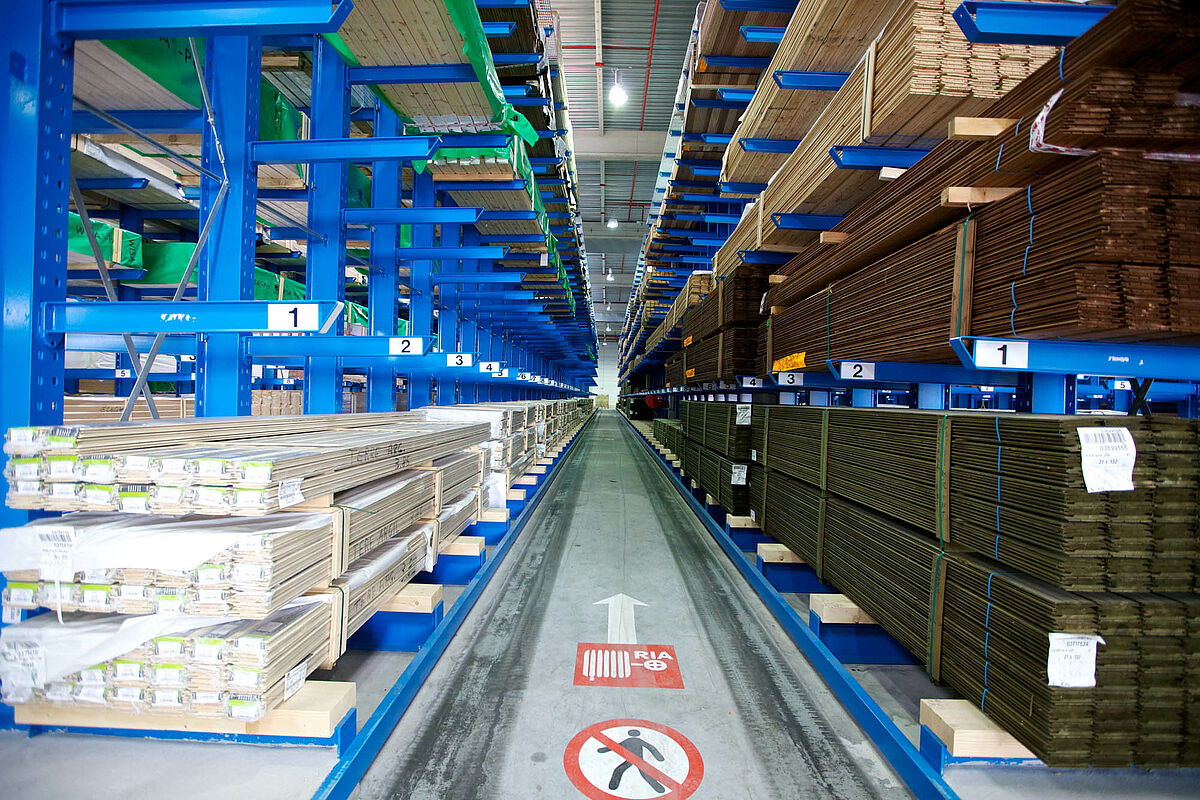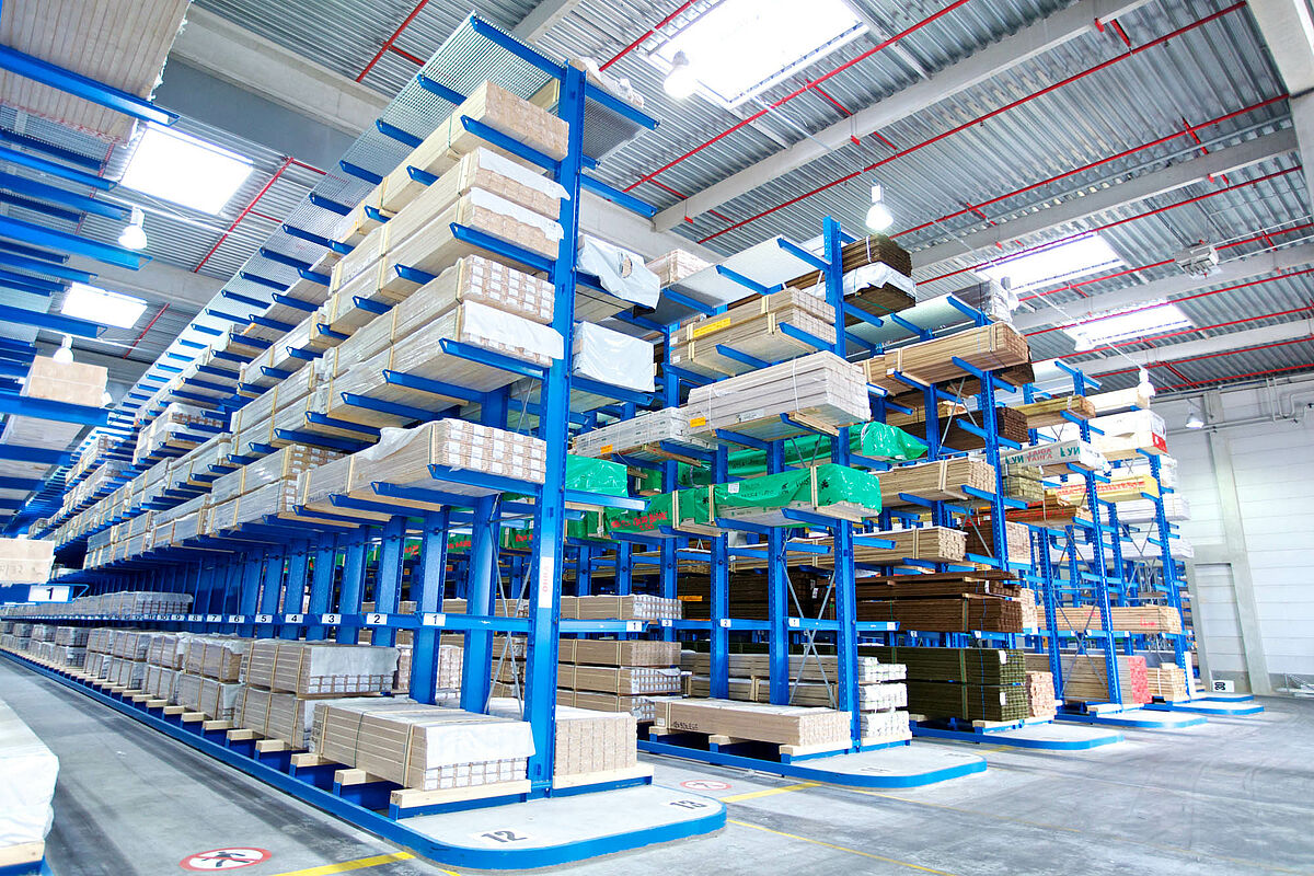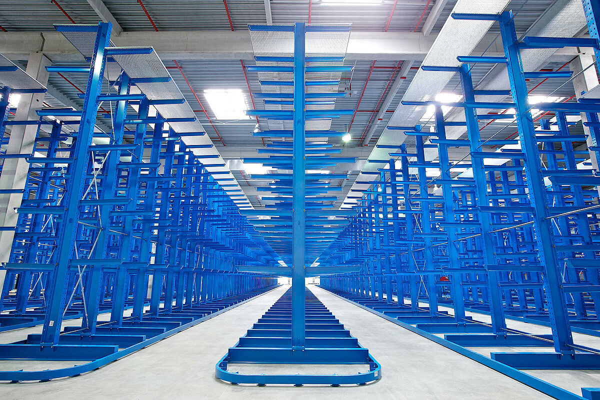 Défini par le département technique du négociant en matériaux de construction, le projet prévoyait un système de rayonnage à bras portants constitué de 15 blocs de 75 m de long et de 8 m de haut chacun, conçu pour le stockage des marchandises d’une longueur pouvant aller jusqu’à 6 mètres d’une part et de 10 autres blocs d’une longueur de 75 m dotés de rayonnages à palettes d’une hauteur de 8,5 m d’autre part. Ce sont au total 22 allées, dont 12 conçues sous forme de rayonnage à bras portants pour allée étroite, qui ont été prévues. Des chariots élévateurs multidirectionnels ont été prévus pour le stockage et le déstockage des marchandises.