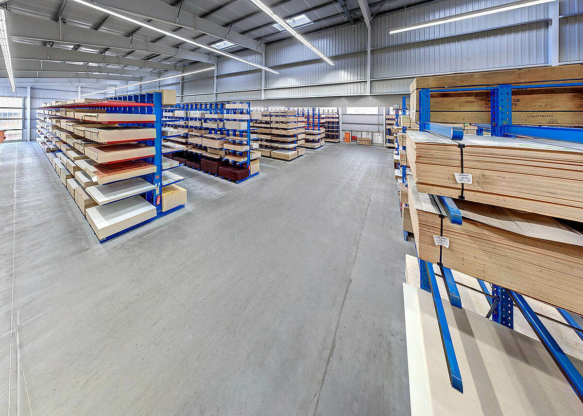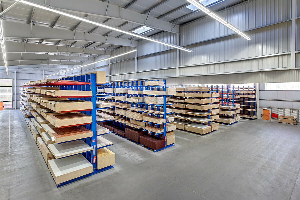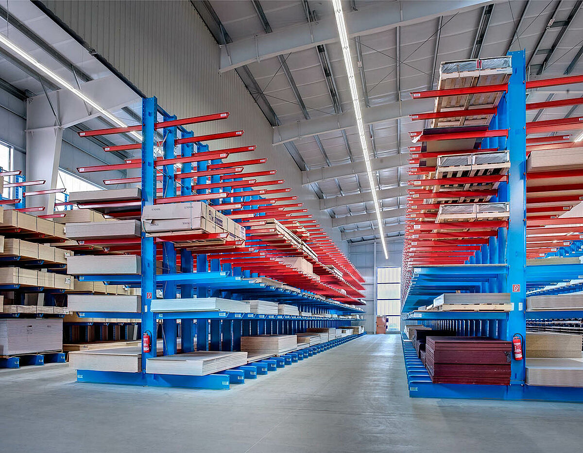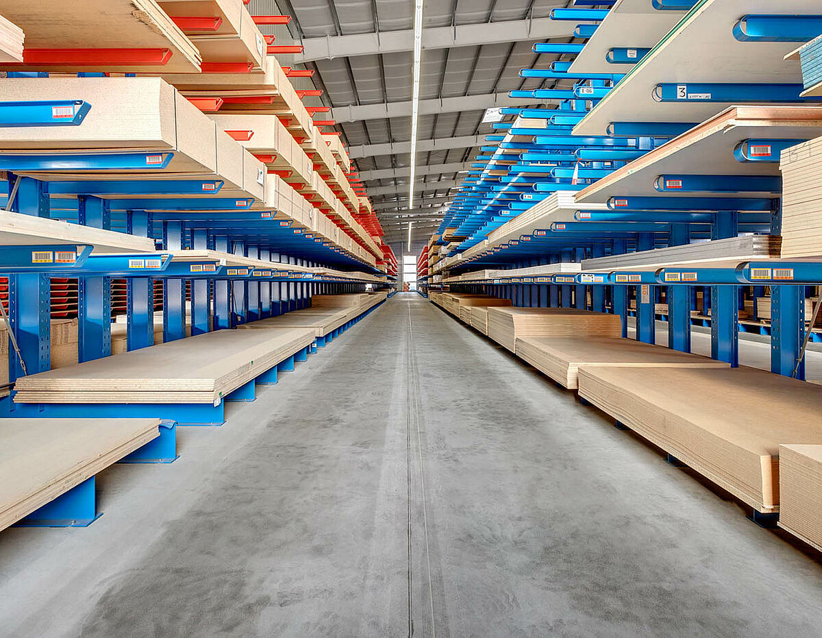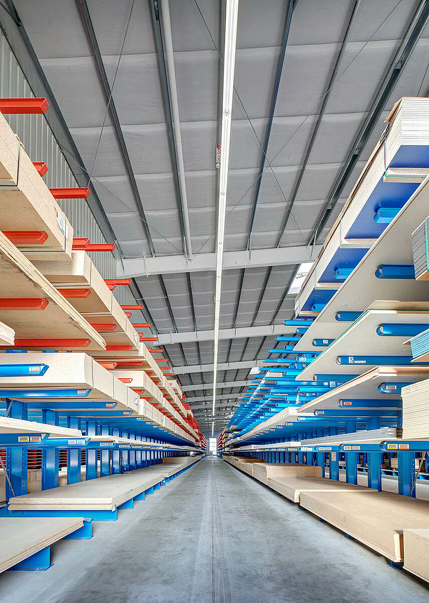 Dans l’entrepôt pour les panneaux les bras des rayonnages cantilevers ont une longueur de 2.100 mm, optimale pour le stockage des panneaux de fibres et bois. La hauteur pour le stockage s’élève à 6.500 mm et le chargement et déchargement s’effectue avec un chariot tri directionnel.