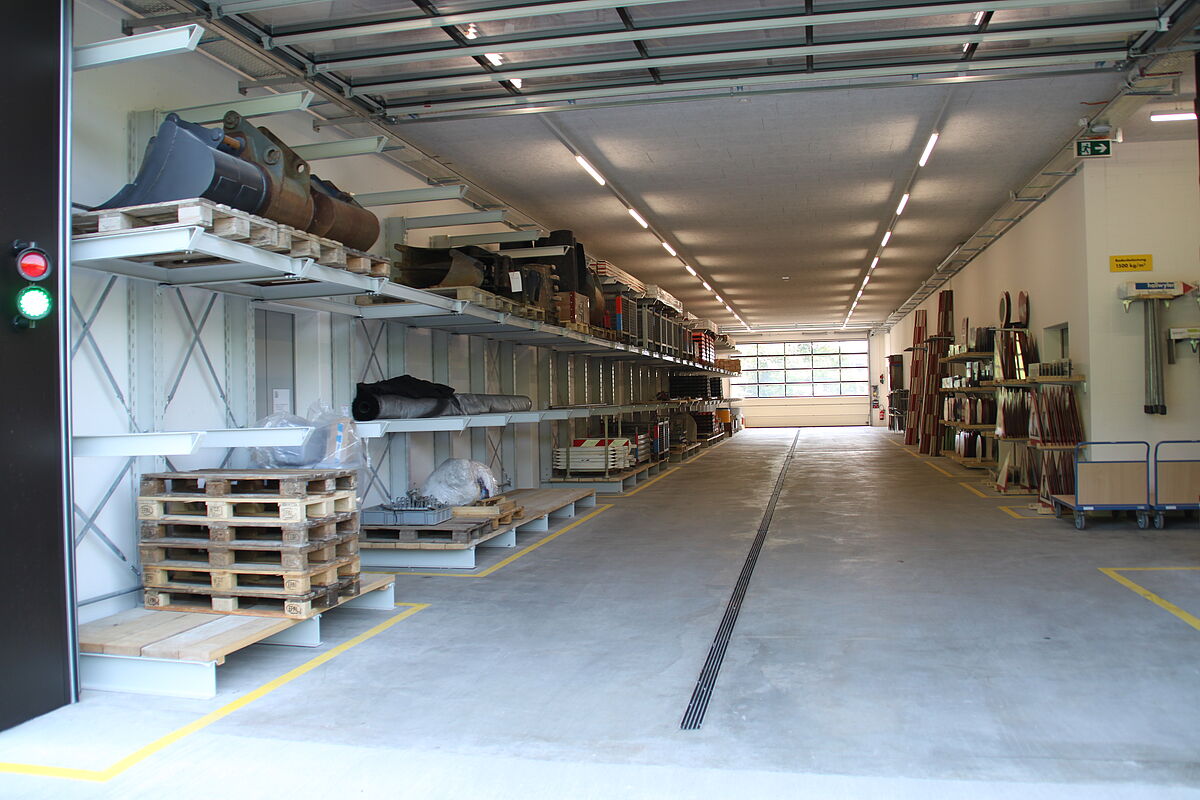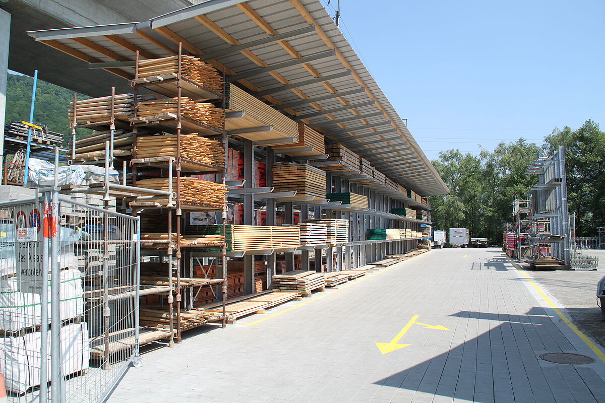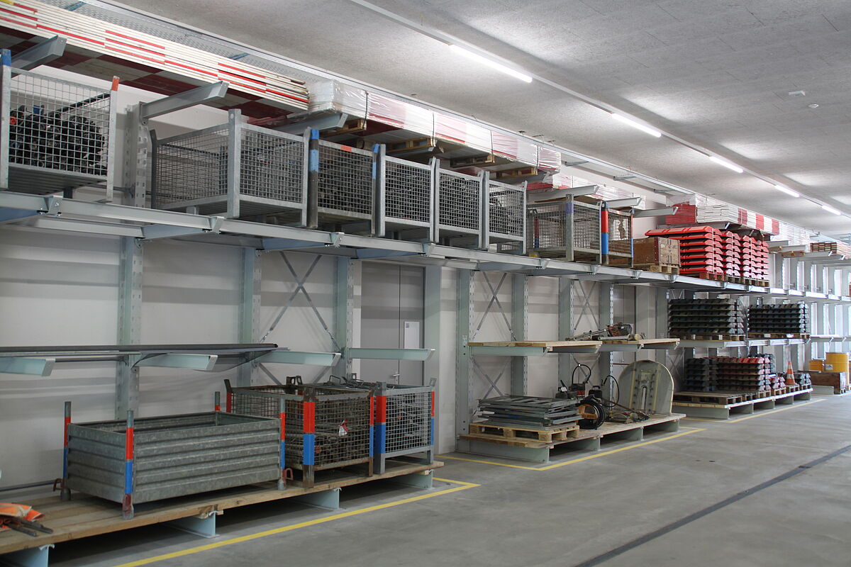 Le dépôt de Gottlieb Müller à Rothrist sert de plate-forme opérationnelle pour les projets de génie civil et de travaux publics de la société depuis début 2018. Afin de stocker efficacement la diversité de ses matériaux de construction, l'entreprise Gottlieb Müller a décidé d'utiliser deux types d'étagères : L'entrepôt est essentiellement équipé de 16 rayonnages à palettes d'une hauteur de 3,5 mètres et d'une longueur de 8,45 mètres. Chaque étagère peut contenir trois euro-palettes ou box palette métalliques pesant jusqu'à 1 tonne. Un espace de stockage supplémentaire dans le hall offre sept rayonnages cantilever simple-face de 3,64 mètres de haut. Certains d'entre eux disposent de traverses et de tablettes, de sorte qu'en plus des produits longs tels que des tuyaux ou des plaques, des colis de différentes dimensions peuvent être stockés sans aucune gêne. D'autres rayonnages cantilever ont été installés à l'extérieur ; ils sont protégés de la corrosion par un procédé de galvanisation à chaud. Il s'agit ici d'une rangée d'étagères de 43,5 mètres de long, dont les cantilevers les plus hauts sont conçus avec des bras de toit : Elles portent de chaque côté un toit légèrement incliné d’une longueur de 2,7 mètres. Ainsi, les matériaux de construction en bois stockés sont protégés de l'impact direct des précipitations. Les bras de tous les cantilever ont une capacité de charge de 1,2 tonne chacun.
