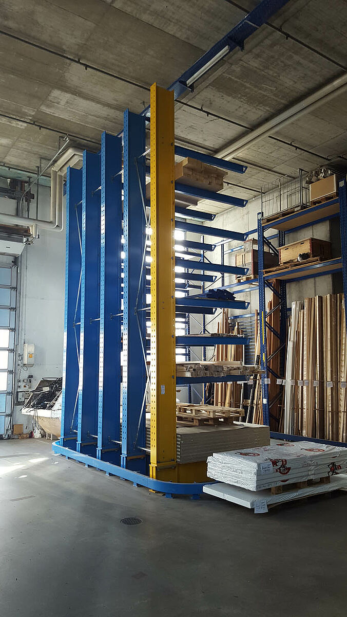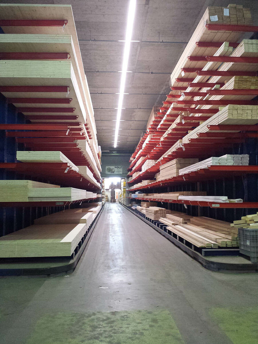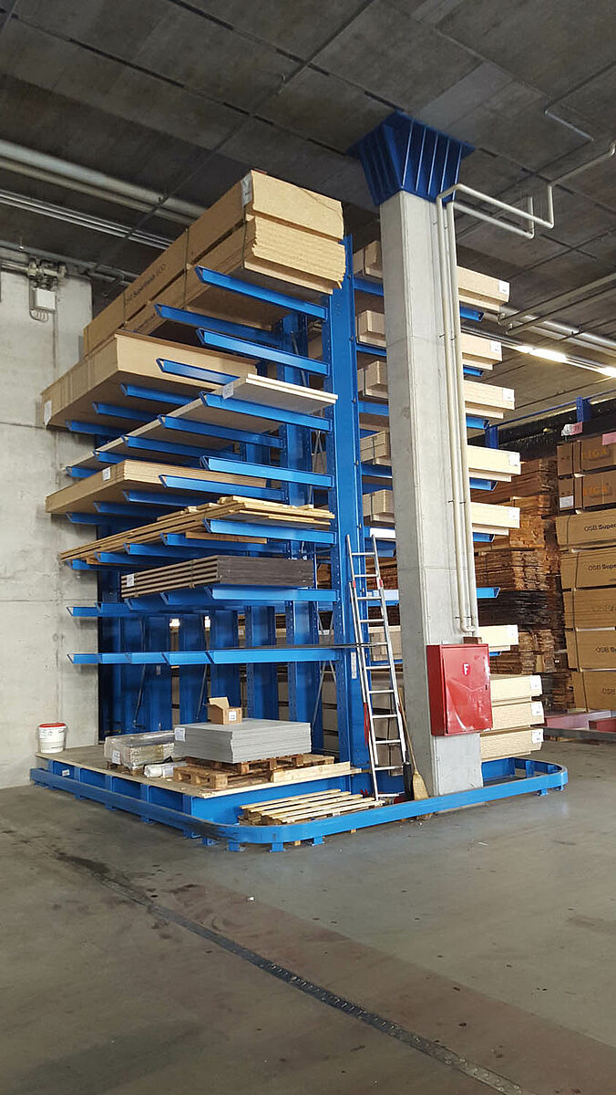 Il a été nécessaire d'installer un système de rayonnage multifonctionnel, étant donné que l'entrepôt devait accueillir divers panneaux – panneaux en bois massif, OSB, d’agglomérés, de contreplaqués, panneaux MDF et autres panneaux plaqués fragiles. Gfeller a agrandi, par conséquent, son magasin au moyen de rayonnages cantilever OHRA : l'entreprise allemande basée à Kerpen est le numéro un européen des rayonnages à bras portants, dont tous les éléments portants sont fabriqués en acier massif laminé à chaud. La construction robuste permet d'obtenir des hauteurs de stockage élevées, une forme compacte et donc une exploitation de la surface en hauteur. Chez Gfeller des montants de plus de 7 mètres de haut ont été utilisés pour permettre de réaliser un entrepôt sur neuf niveaux.