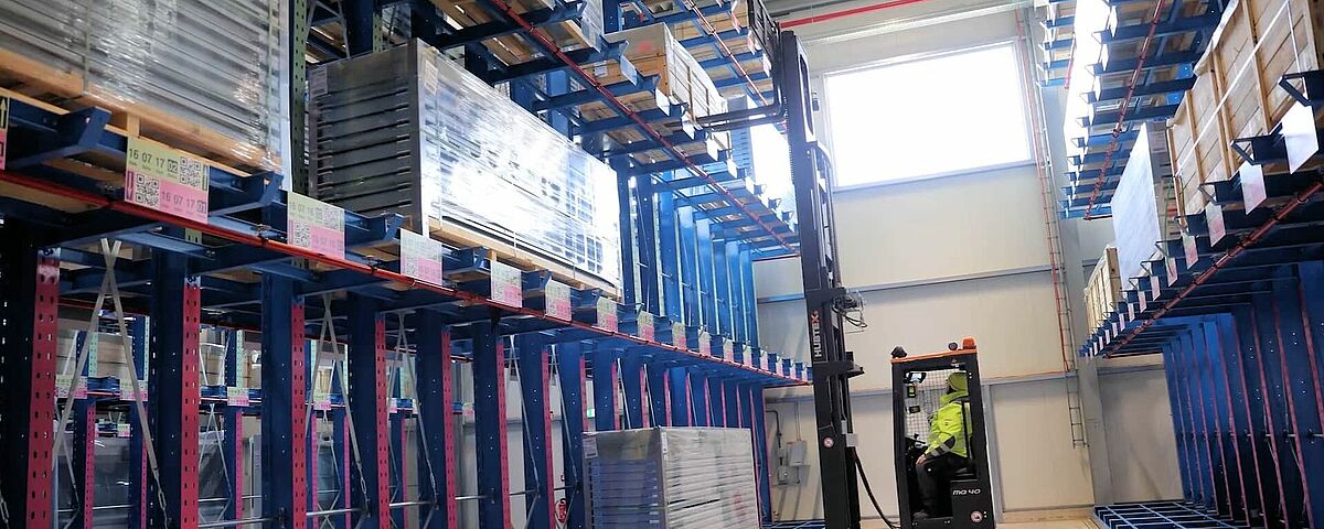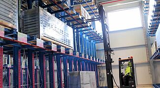 En investissant dans un nouveau site d’expédition, Kardex a considérablement augmenté ses capacités de stockage. L’entreprise s’en sert pour entreposer les composants et modules destinés à ses propres systèmes intralogistiques, qui doivent ensuite être envoyés à ses clients. Un total de neuf rayonnages cantilever conçus par OHRA et pouvant atteindre 48 m de long offre un espace suffisant (sur quatre niveaux de stockage) pour les colis mesurant entre 1 250 et 4 300 mm de long. Chaque bras peut supporter jusqu’à 1 250 kg, et chaque montant jusqu’à 3 750 kg par côté. L’utilisation d’un chariot élévateur latéral a permis à Kardex de réduire la largeur des allées entre les différents rayonnages cantilever, pour une meilleure optimisation de l’espace disponible. Un rayonnage à palettes standard et deux rayonnages à palettes en double profondeur pouvant chacun supporter jusqu’à 2 400 kg viennent compléter les rayonnages cantilever. Les rayonnages en double profondeur permettent de stocker des colis de 3,2 m maximum, pesant jusqu’à 1,5 tonne.
