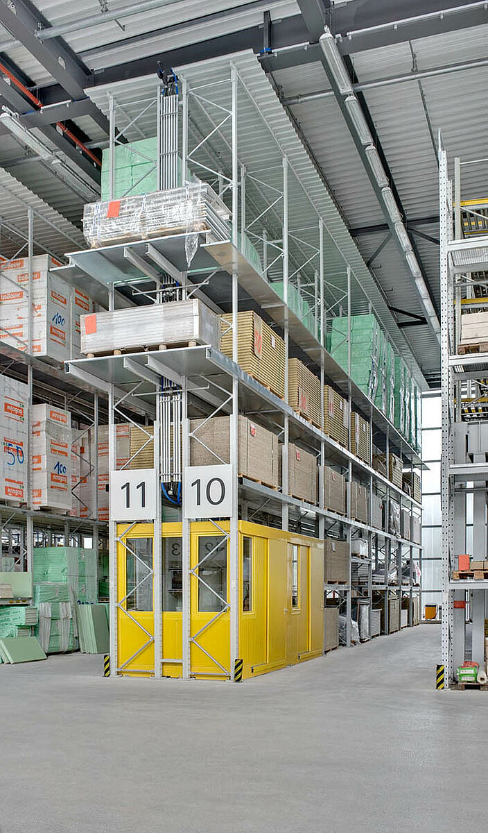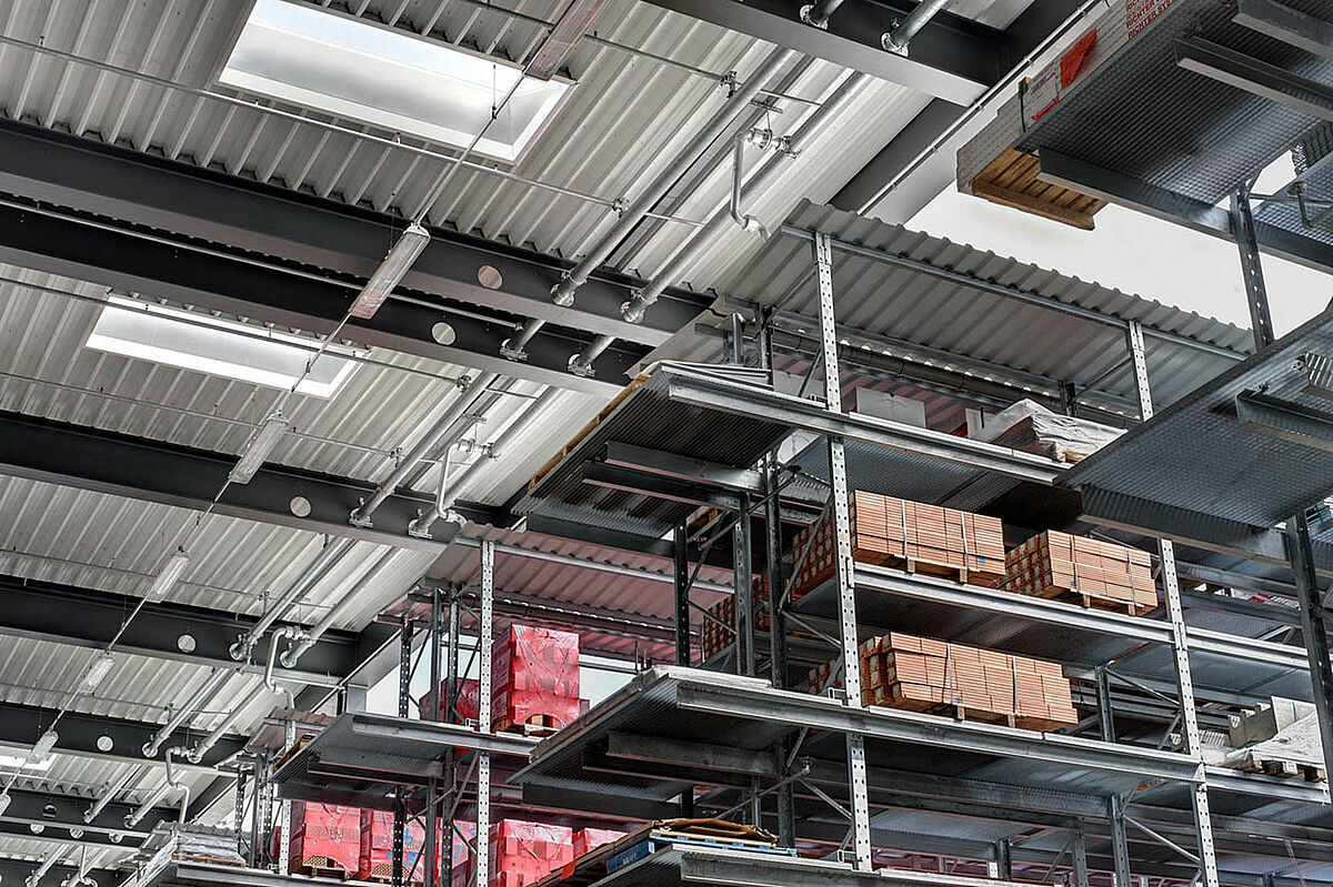 Certains matériaux sont stockés à l’extérieur et à l’intérieur dans des rayonnages à palettes robustes OHRA. Sur des emplacements avec une larguer de 2900 mm il est possible de stocker aisément de palettes avec des produits débordants. Aux extrémités des rayonnages à palettes se trouvent des stations de transfert qui permettent de préparer les commandes rapidement et efficacement. De plus, grâce à la grande charge admissible des rayonnages, il est possible de charger des conteneurs dans le système.
