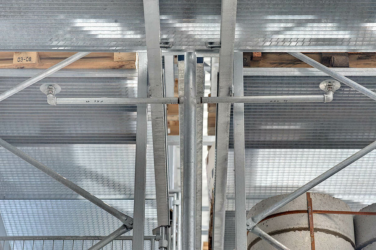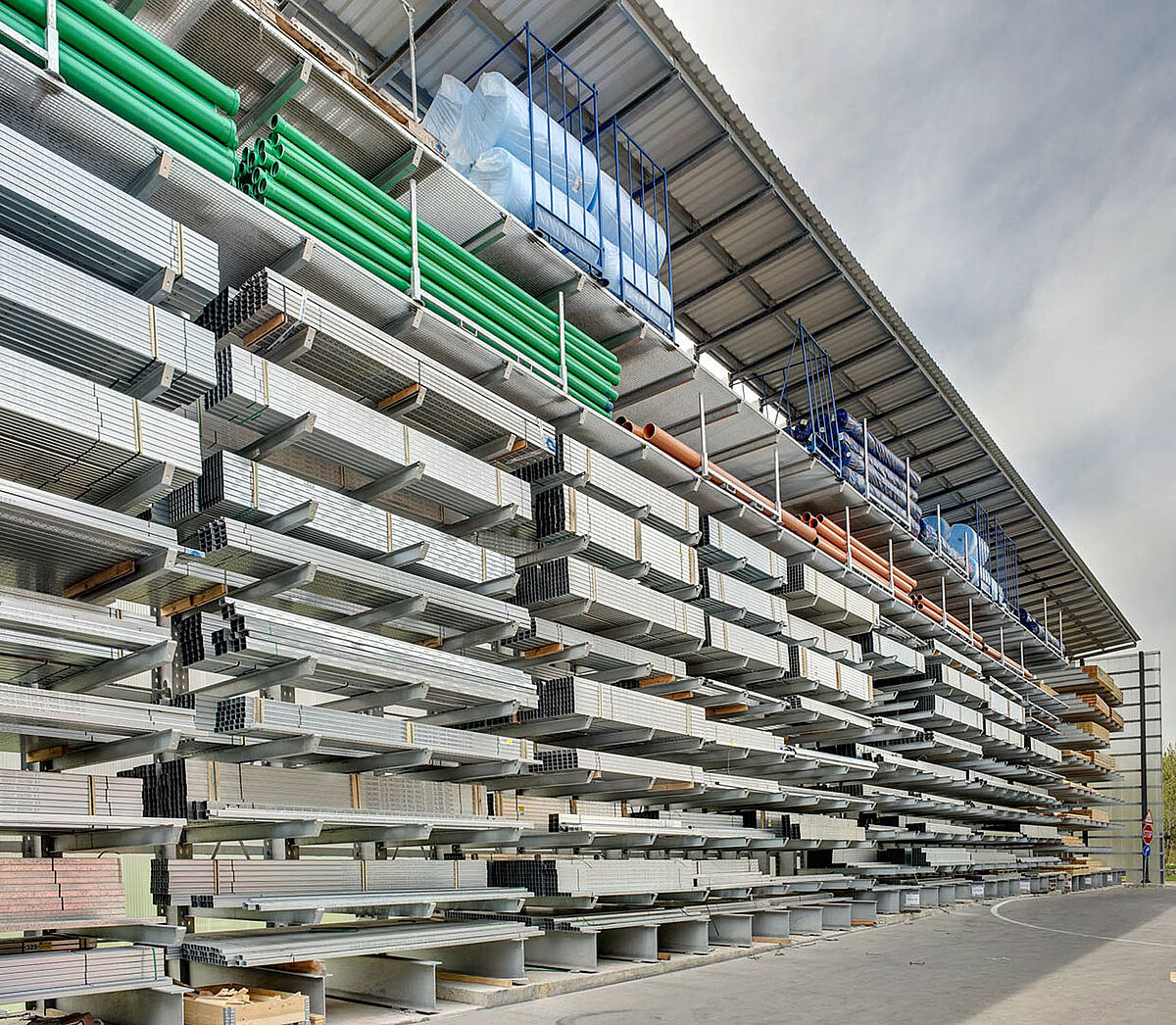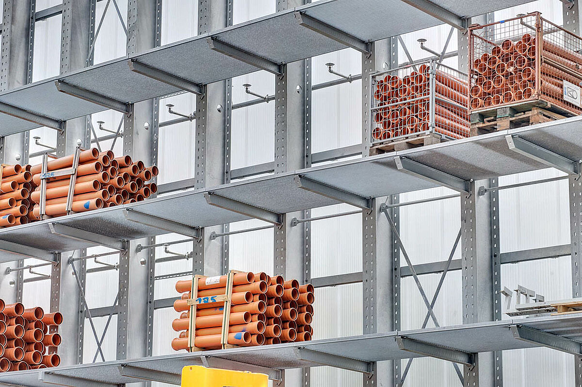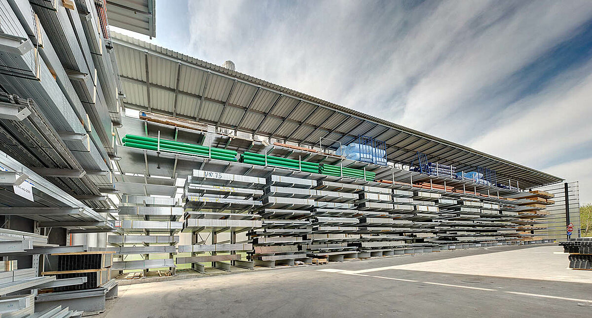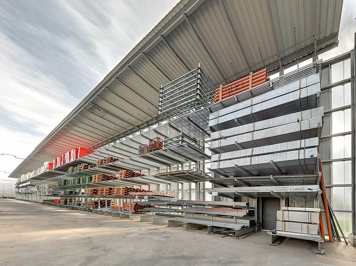 Par exemple des rayonnages cantilevers en finition galvanisée pour l’extérieur. Dans ces rayonnages il est possible de stocker des produits comme des tubes, des dalles de béton ou des chevrons bois. Les rayonnages sont équipés avec une toiture et des caillebotis pour les petites marchandises. Un défi de la réalisation était la pente de la toiture vers le côté qui était nécessaire à cause des particularités du terrain.