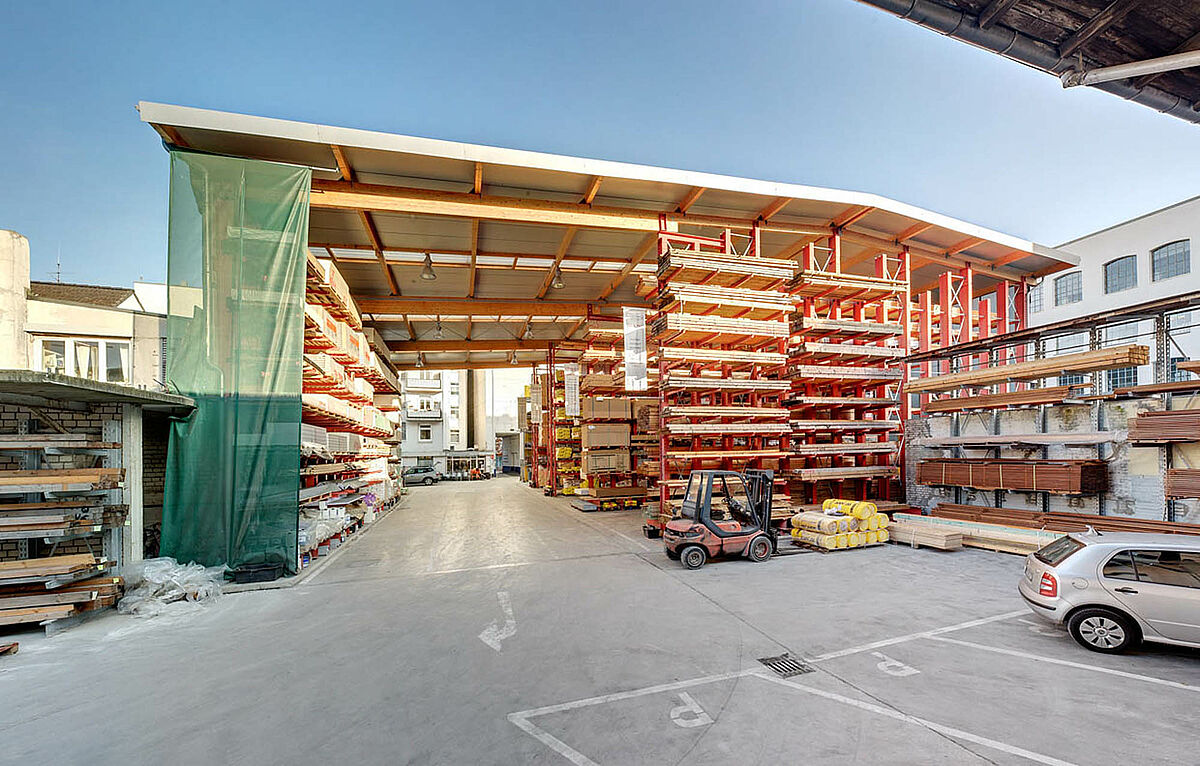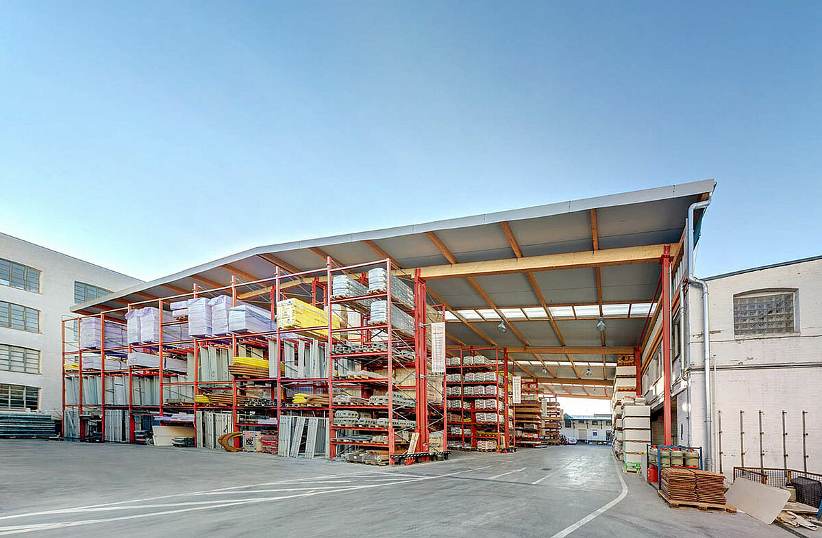 Le nouveau bâtiment de stockage est une spécialité de la société OHRA. Les montant des rayonnages cantilevers et à palettes sont utilisés pour le stockage des biens et en même temps ils supportent la toiture. Deux Rayonnages avec une hauteur de 9.500 mm supportent la toiture. En plus, une zone de chargement de 10 m a été réalisée. La charpente de toiture en bois était fournie par le client.