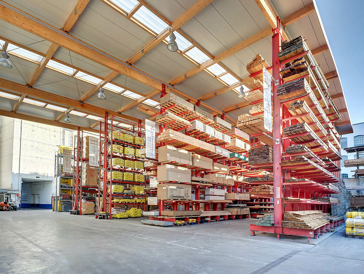 Grâce à sa large gamme de produits, la société OHRA a construit un système universel pour le client, ce qui permet de stocker du matériel avec des différences de poids et dimensions importantes. Dans le bâtiment se trouvent les produits pour la construction sèche, bois ou matériel isolant. Dans l’entrepôt, de construction robuste, en plein air se trouvent par exemple des pierres, des cheminées etc.