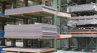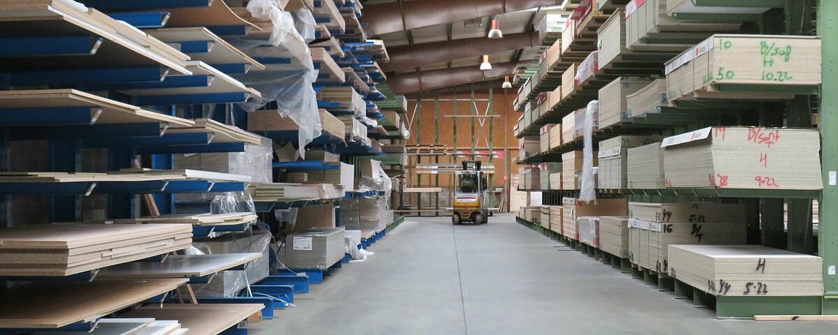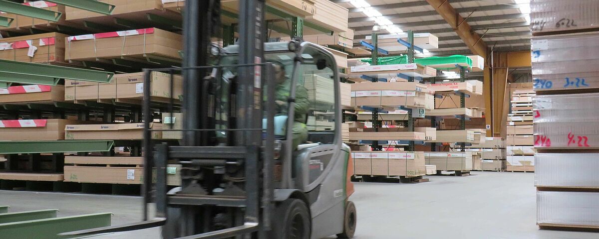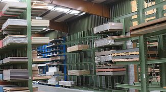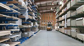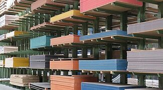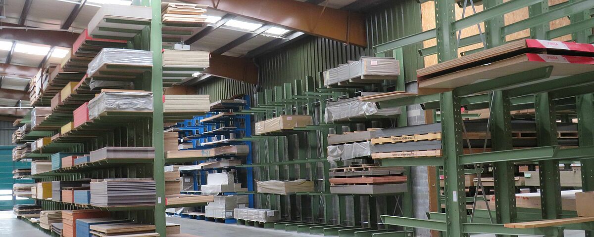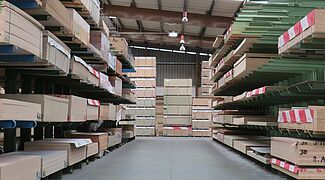Par conséquent, OHRA a installé divers systèmes de rayonnage dans la zone de stockage : En faisaient partie les rayonnages cantilever, dont les bras d’une longueur de 1.300 millimètres ont une capacité de charge de 750 kilogrammes ; le niveau de stockage le plus élevé se situe à 5 mètres. Ici, ce sont surtout les panneaux générant un haut chiffre d'affaires qui sont stockés : ils doivent dès lors être rapidement déstockés. Le grand nombre d'articles différents dans le domaine des panneaux HPL a obligé l’utilisation d’un rayonnage à palettes afin de permettre leur stockage sur des palettes spéciales dotées d’une grandeur de 3050 x 1.300 millimètres : Pour une longueur d’environ dix mètres et une hauteur d’environ 6 mètres, il dispose de 15 niveaux de stockage. Il en résulte ainsi une multitude de surfaces de stockage, ce qui permet un stockage homogène par compartiment et un accès rapide à la marchandise.