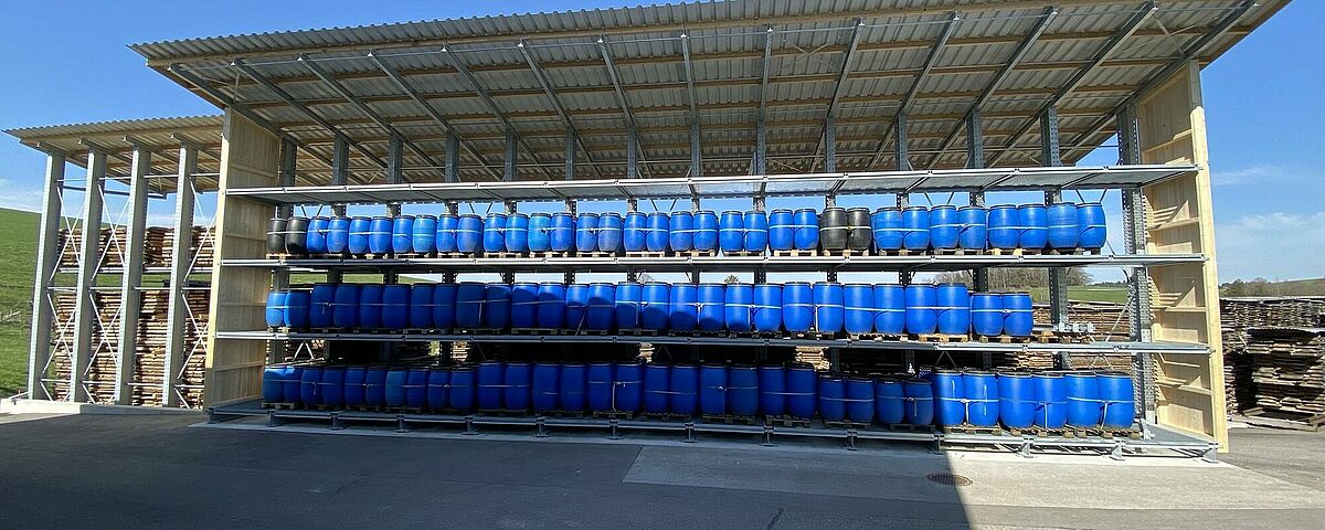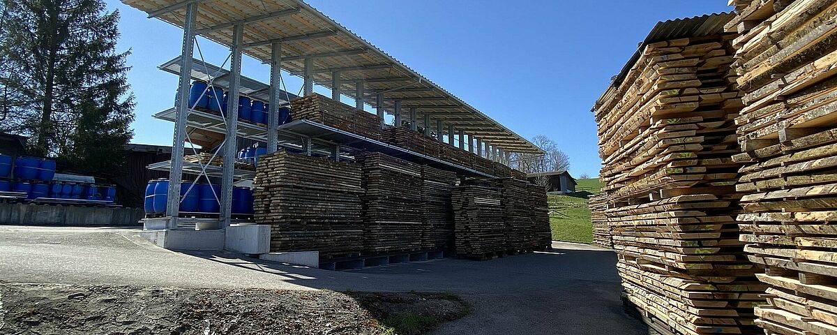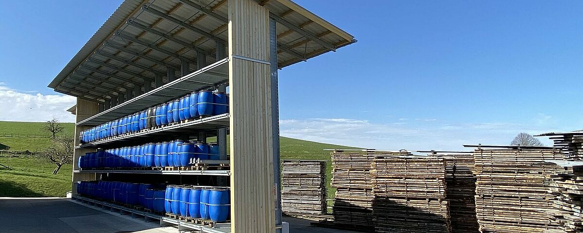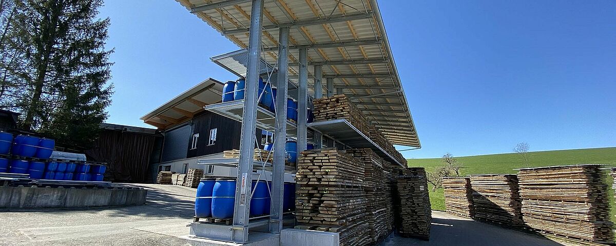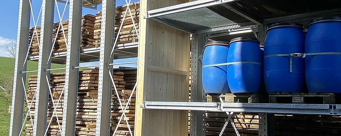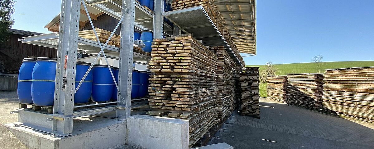 Jusqu'alors, Nyfeler empilait les planches de hêtre que l'atelier de menuiserie utilise, entre autres, pour la production du système de chemin de roulement CUBORO, ainsi que le bois de chauffage et d'autres articles à l'extérieur. Mais les europalettes utilisées à cette fin s'altéraient constamment, ce qui donnait lieu à des piles dangereusement tordues. De plus, pour accéder à la marchandise, il fallait souvent péniblement déstocker les articles puis les rempiler à la fin. Pour les protéger des intempéries, Nyfeler avait également recouvert chaque pile de bâches, ce qui demandait beaucoup d'efforts supplémentaires pour la manutention. Enfin, et surtout, l'entrepôt occupait une surface excessivement grande.