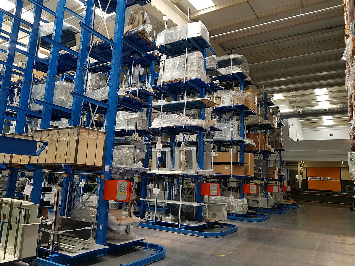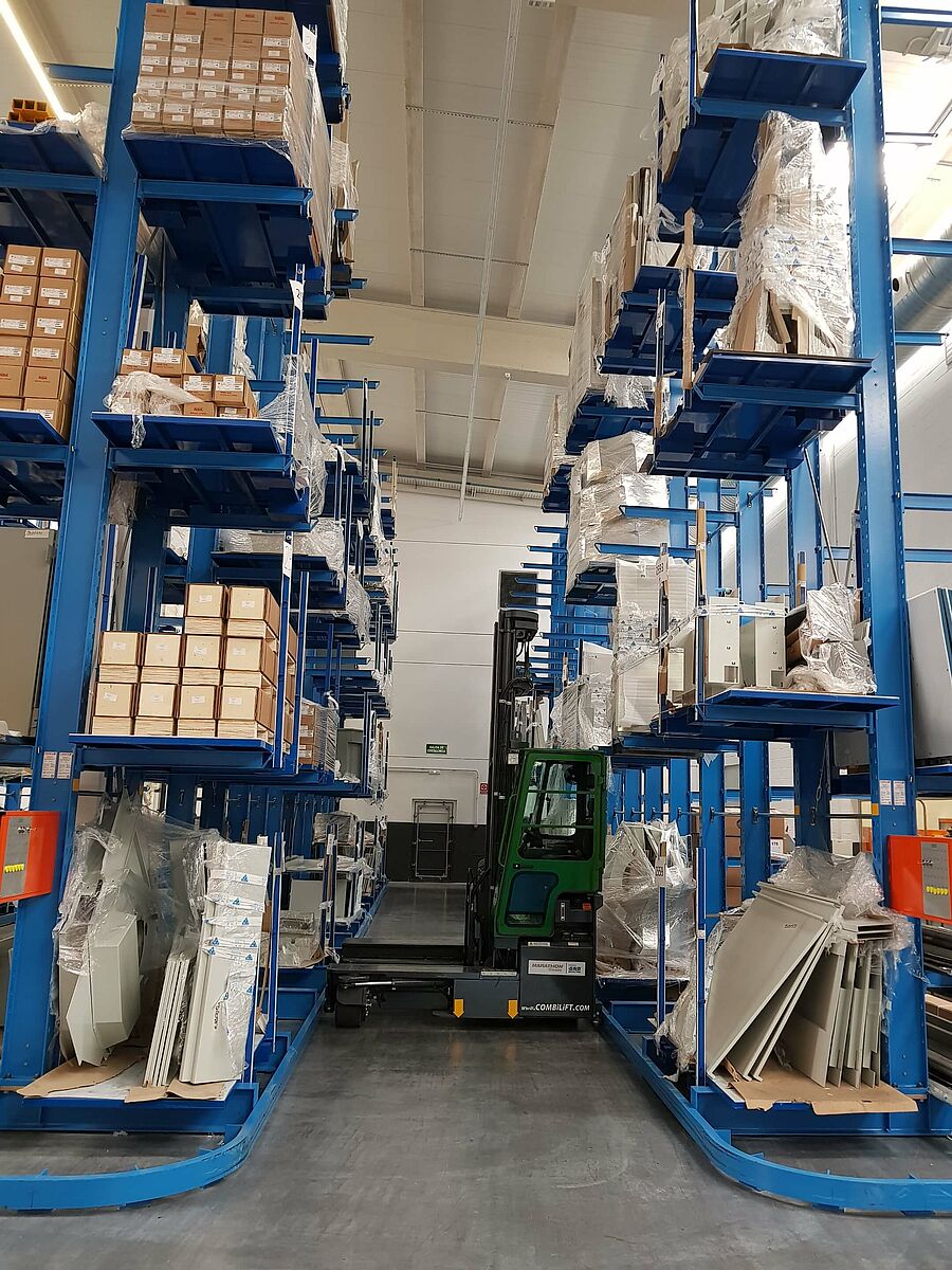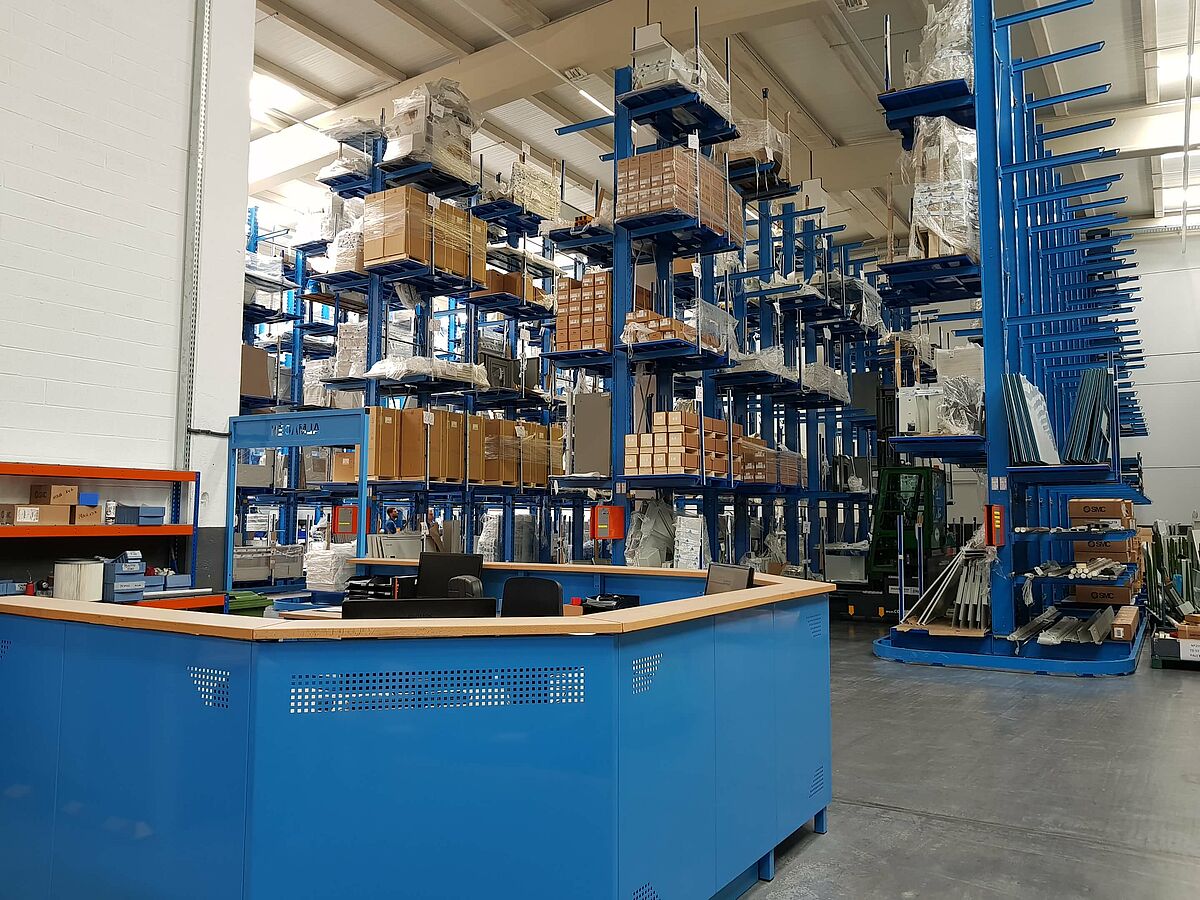 Au total, sept rayonnages cantilever de 15,1 à 22,5 mètres de longueur ont été installés. Contrairement aux rayonnages à palettes, les rayonnages cantilever permettent le stockage d'articles de longueurs différentes grâce à l'absence de supports intermédiaires gênants. Parallèlement, Seuner peut même ranger des barres ou des marchandises longues dans les rayonnages. Vu que tous les éléments porteurs des systèmes de rayonnages OHRA sont constitués de profilés en acier massif, un système de stockage étroit à grande capacité de charge est possible. Chaque côté des rayonnages, qui est monté pour Seuner, porte un poids de 3280 kg poids par côté, tandis que les bras de 1,15 mètres présentent une capacité de charge de 820 kg. Les rails de guidage fixés sur les pieds de cantilever permettent d'utiliser un chariot élévateur pour les couloirs étroits. En outre, Seuner a installé une série de rayonnages à palettes OHRA avec cinq niveaux de stockage et un compartiment de stockage de 3 à 4 mètres. La capacité de charge par compartiment de stockage oscille entre 3000 et 4000 kilogrammes.