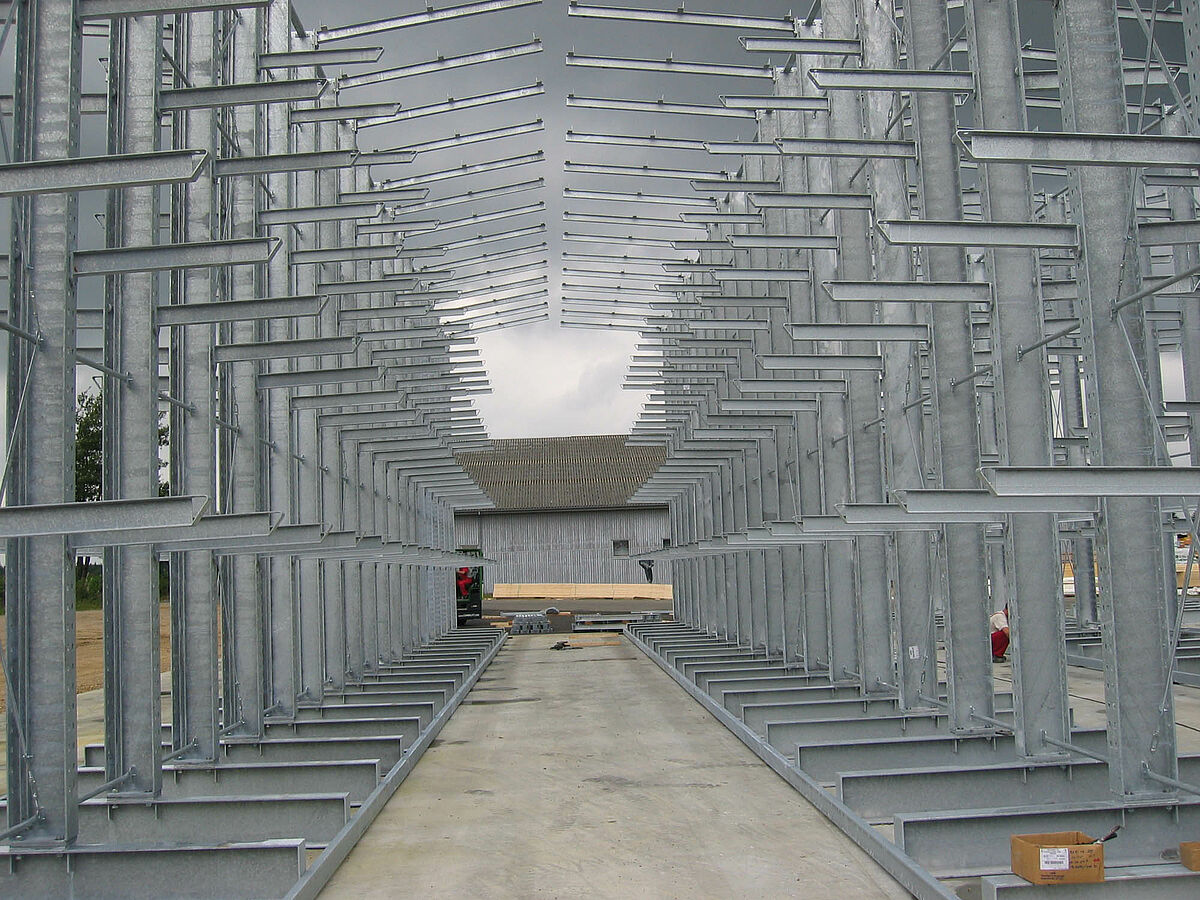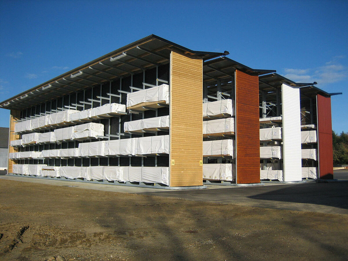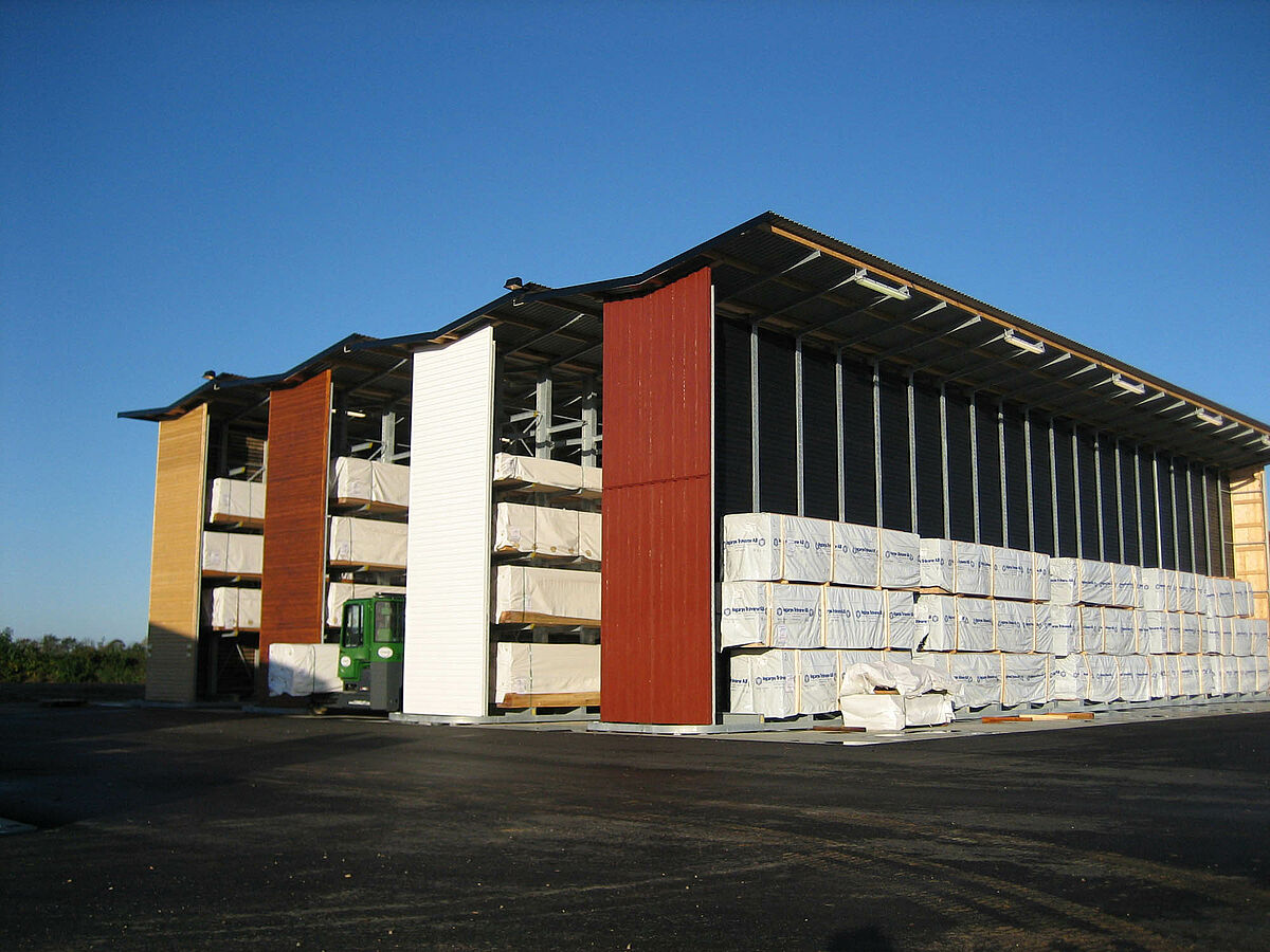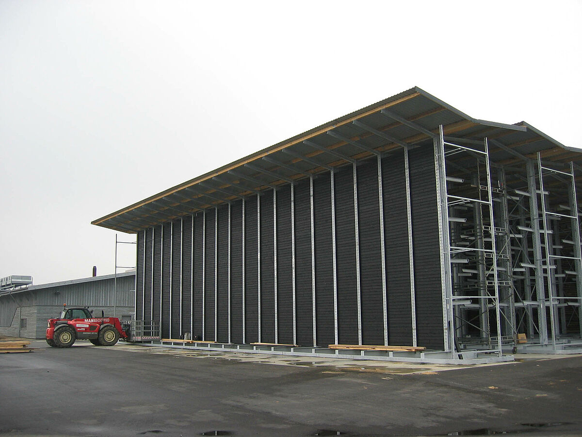 Les planches de bois non traitées étaient auparavant entreposées en plein air. Cela nécessitait l’utilisation d’une grande surface au sol et la manutention des profilés en bois demandait beaucoup de temps. Le client souhaitait par conséquent créer une possibilité d’entreposage du bois à proximité immédiate du processus d’usinage, à l’intérieur de l’atelier de production déjà existant. L’entrepôt devait également occuper le moins de place possible afin de maintenir les coûts relatifs à la surface au sol en béton et à la surface de toiture aussi bas que possible. Un agrandissement dans le futur devait être possible sans que des transformations soient nécessaires.