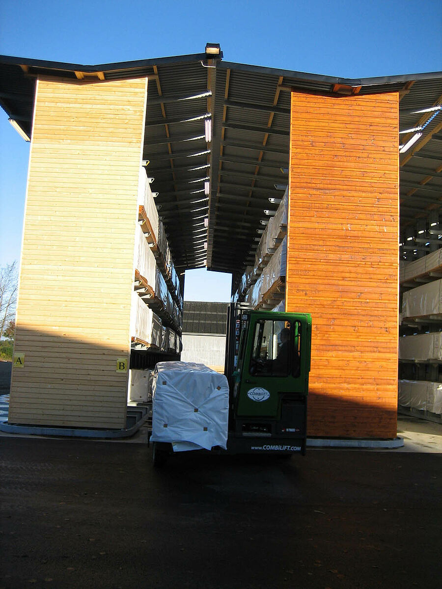 De la même façon, le revendeur local de chariots élévateurs fut dès le départ intégré au projet. Les allées ont été équipées de rails de guidage, conformément aux exigences liées au chariot à prise latérale, et les zones d’entrée situées de part et d’autre des allées protégées du vent et de la pluie grâce à des panneaux dotés d’un revêtement. Les éléments de toiture se chevauchant assurent une protection directe contre les intempéries tout en permettant une ventilation suffisante. Les rayonnages externes ont été équipés de palplanches qui font également office de protection contre les intempéries.