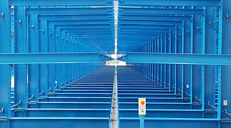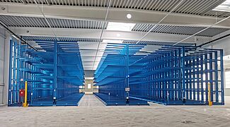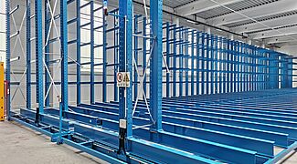 Il se compose d’un système de rayonnages fixe simple face et de trois étagères à double face montées sur un support mobile. En déplaçant les supports mobiles pour former un bloc de stockage compact, seule une allée de rayonnages est ouverte pour la manutention avec un chariot multidirectionnel - une utilisation efficace de l'espace est donc garantie. Les rayonnages mobiles mesurent chacun d’eux environ 50 m de long et 6;5 m de haut. Des bras portants de 2,1 m de long forment cinq niveaux de stockage et supportent chacun une charge d’environ 800 kg. Au total, chaque support mobile peut ainsi supporter jusqu’à 528 tonnes. Malgré cette capacité de charge, les supports mobiles se déplacent à une vitesse d’environ 4 mètres par minute, ce qui écourte sensiblement les temps d’attente pour que l’allée de manutention de 4,59 m de large soit ouverte.