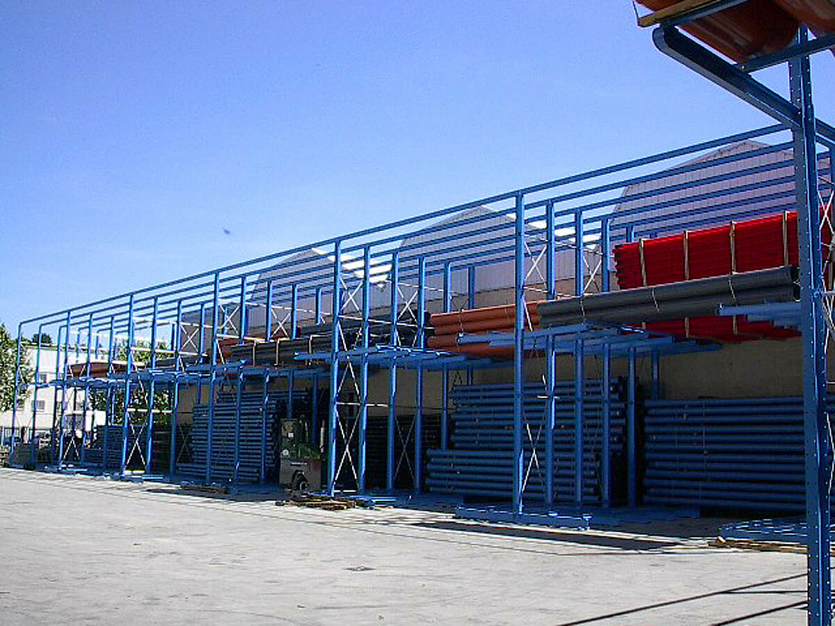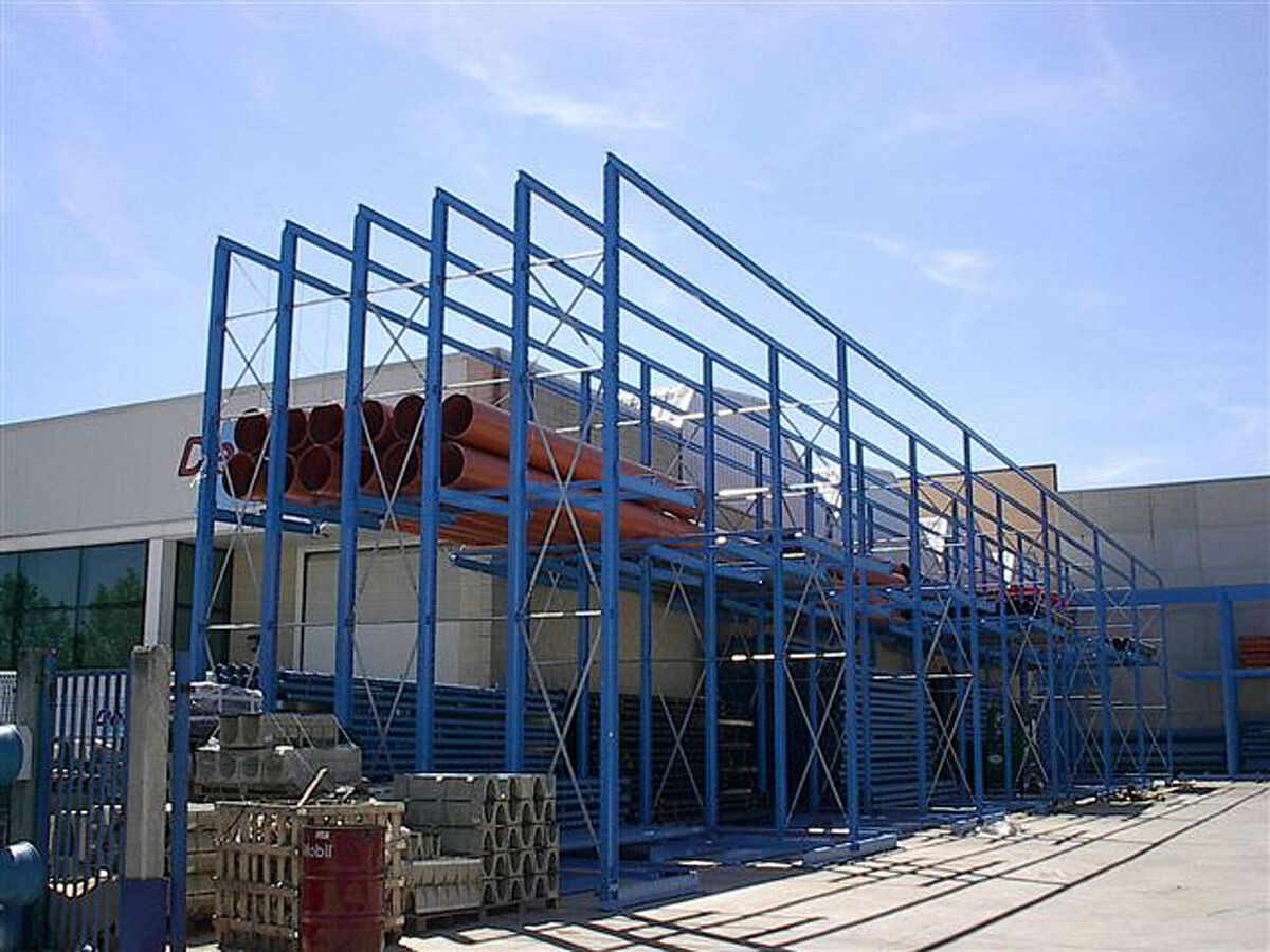 Comme complément OHRA a livré et monté des rayonnages cantilevers robustes pour stocker des produits qui ne sont pas fréquemment nécessaires. Les colis de tubes sont stockés sur plusieurs niveaux, avec une longueur des bras de 2500 mm, le client peut même stocker 2 colis par bras.