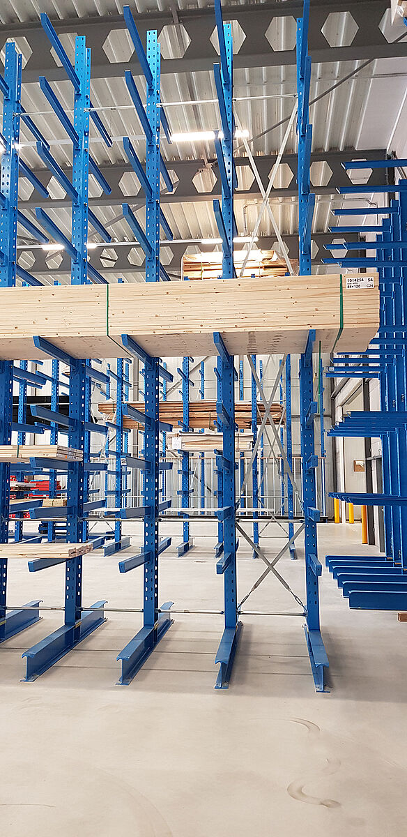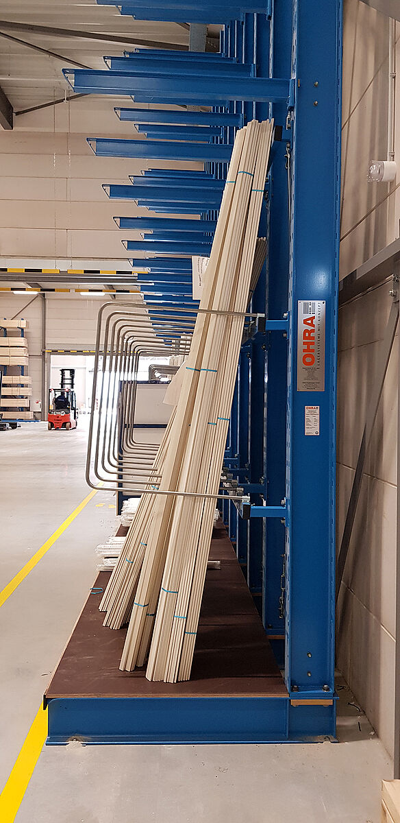 Puisque les systèmes de rayonnages OHRA ont largement fait leurs preuves sur le site de Gouderak, le nouveau site a été aussi équipé de systèmes de stockage du leader européen de rayonnages cantilevers. La flexibilité des rayonnages joue désormais en faveur de leur utilisation : Les tablettes grillagées permettent ainsi un stockage continu des formats de palettes et de marchandises les plus divers dans les rayonnages cantilevers sans support intermédiaire. Cela évite d'endommager la marchandise au cours du stockage et du déstockage. Compte tenu de la stabilité de construction des rayonnages - tous les éléments porteurs sont en profilés en acier pleins - la capacité de charge d'un casier d'un rayonnage à palettes reste inchangée à 7377 kilogrammes pour une largeur de casier de 4200.