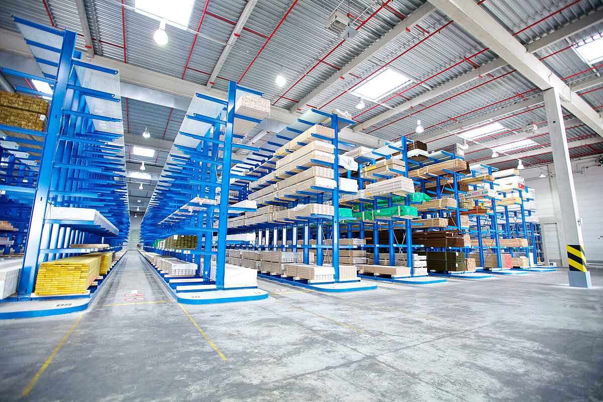 Le groupe Derrey, négoce en matériaux de construction a équipé sa nouvelle agence « Gedibois Derrey » à Metz de rayonnages cantilever OHRA. Grâce à des solutions spéciales, les rayonnages s'adaptent parfaitement aux différentes gammes de produits et aux contraintes du bâtiment. Pour se faire, des rayonnages asymétriques ont été utilisés : Il s'agit de rayonnages double face dont les bras de gauche et de droite se différencient par leur capacité de charge et leur longueur. Il est ainsi possible de stocker de manière efficace et peu encombrante, de nombreux bois et panneaux aux dimensions différentes. Une partie des rayonnages se trouve dans un hall ouvert, de ce fait, les premières colonnes et bras d'une rangée peuvent être exposés aux intempéries. C'est pour cette raison qu'OHRA a galvanisé à chaud ces parties du rayonnage, tandis que les autres éléments ont été revêtus d'une peinture en poudre